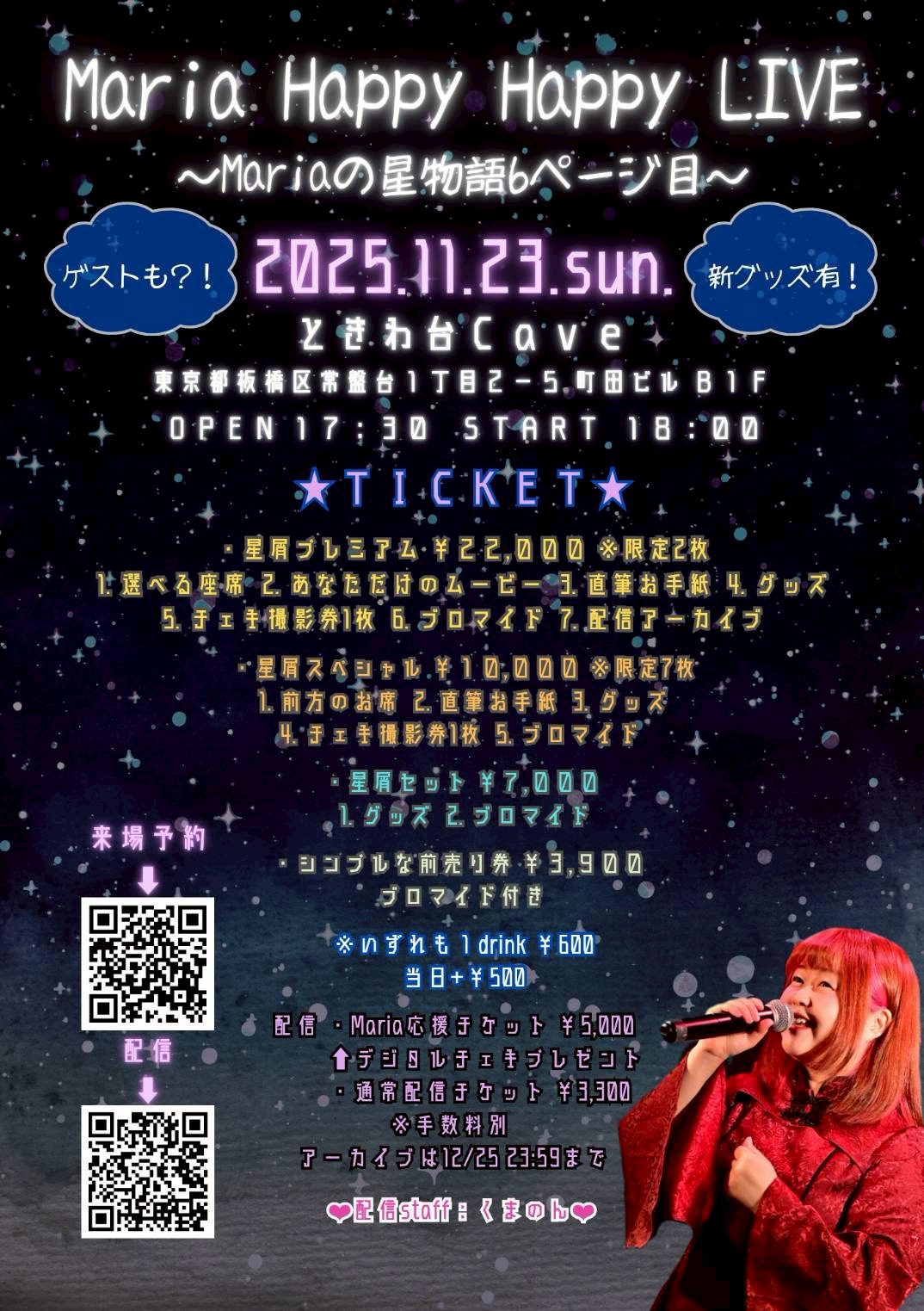 ★星屑プレミアム(限定2枚)¥22,000①選べる座席 ②あなただけのメッセージ動画 ③Mariaからの直筆お手紙 ④サイン入り新発売グッズ ⑤チェキ1枚 ⑥サイン入りブロマイド ⑦配信チケットプレゼント